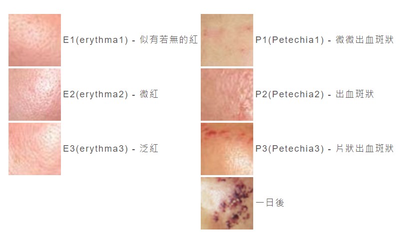 1064nm 雷射打下之後,皮膚將微紅或滲血 (E&P), 視治療設定 ( 適應症及病患接受度 ) 不同有所差異感覺為微熱至微刺。